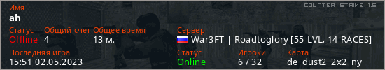 Играет на Counter Strike 1.6 сервере. Страна: РоссияПервый раз замечен 11:51 30.04.2023