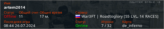 Играет на Counter Strike 1.6 сервере. Страна: РоссияПервый раз замечен 16:17 25.07.2024