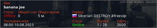 Играет на Counter Strike Source сервере. Страна: РоссияПервый раз замечен 07:54 10.08.2023