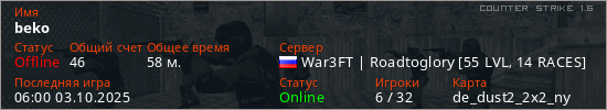 Играет на Counter Strike 1.6 сервере. Страна: РоссияПервый раз замечен 09:52 20.11.2022