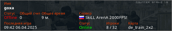 Играет на Counter Strike 1.6 сервере. Страна: РоссияПервый раз замечен 23:29 05.04.2025