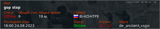 Играет на Counter Strike 1.6 сервере. Страна: РоссияПервый раз замечен 12:47 31.01.2022