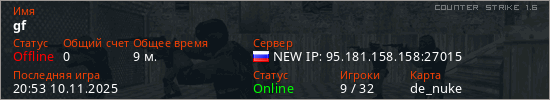 Играет на Counter Strike 1.6 сервере. Страна: РоссияПервый раз замечен 15:26 28.10.2025