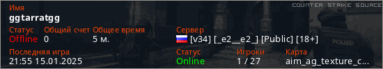 Играет на Counter Strike Source сервере. Страна: РоссияПервый раз замечен 21:47 15.01.2025