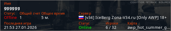 Играет на Counter Strike Source сервере. Страна: РоссияПервый раз замечен 21:47 27.01.2026