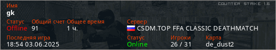 Играет на Counter Strike 1.6 сервере. Страна: РоссияПервый раз замечен 20:44 03.08.2024