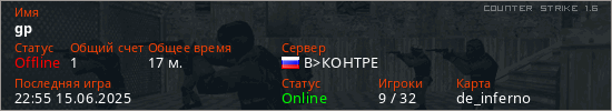 Играет на Counter Strike 1.6 сервере. Страна: РоссияПервый раз замечен 04:04 06.05.2025