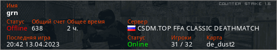 Играет на Counter Strike 1.6 сервере. Страна: РоссияПервый раз замечен 13:52 07.01.2023