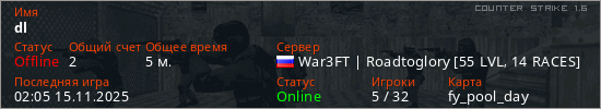 Играет на Counter Strike 1.6 сервере. Страна: РоссияПервый раз замечен 01:29 15.11.2025