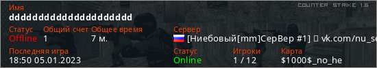 Играет на Counter Strike 1.6 сервере. Страна: РоссияПервый раз замечен 18:46 05.01.2023
