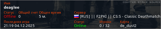 Играет на Counter Strike Source сервере. Страна: РоссияПервый раз замечен 21:17 04.12.2025