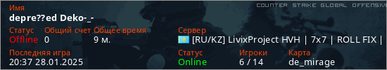 Играет на Counter Strike Global Offensive сервере. Страна: КазахстанПервый раз замечен 20:59 27.01.2025