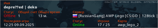 Играет на Counter Strike Global Offensive сервере. Страна: РоссияПервый раз замечен 22:47 05.09.2025