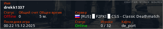 Играет на Counter Strike Source сервере. Страна: РоссияПервый раз замечен 23:42 14.12.2025