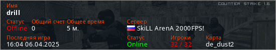 Играет на Counter Strike 1.6 сервере. Страна: РоссияПервый раз замечен 15:51 06.04.2025