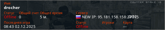 Играет на Counter Strike 1.6 сервере. Страна: РоссияПервый раз замечен 08:39 02.12.2025