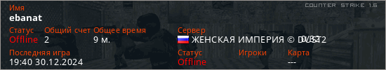 Играет на Counter Strike 1.6 сервере. Страна: РоссияПервый раз замечен 18:34 30.12.2024