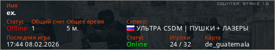 Играет на Counter Strike 1.6 сервере. Страна: РоссияПервый раз замечен 17:29 08.02.2026