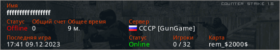 Играет на Counter Strike 1.6 сервере. Страна: РоссияПервый раз замечен 17:47 08.12.2023