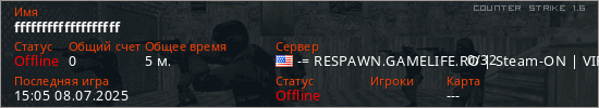 Играет на Counter Strike 1.6 сервере. Страна: СШАПервый раз замечен 14:47 08.07.2025