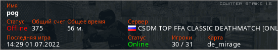 Играет на Counter Strike 1.6 сервере. Страна: РоссияПервый раз замечен 13:04 21.06.2021