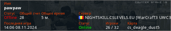 Последний раз был в сети 14:06 08.11.2024 Игрок с таким ником замечен на 5 серверах