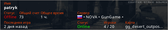 Играет на Counter Strike Source сервере. Страна: РоссияПервый раз замечен 16:22 22.10.2022