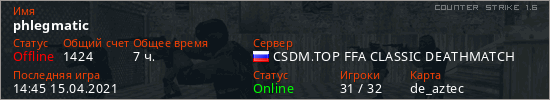 Играет на Counter Strike 1.6 сервере. Страна: РоссияПервый раз замечен 16:21 15.11.2019