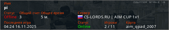 Играет на Counter Strike 1.6 сервере. Страна: РоссияПервый раз замечен 04:22 16.11.2025