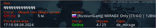 Играет на Counter Strike Global Offensive сервере. Страна: РоссияПервый раз замечен 17:02 08.06.2024