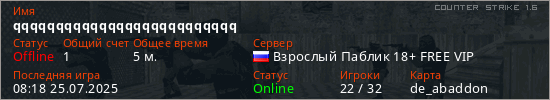Играет на Counter Strike 1.6 сервере. Страна: РоссияПервый раз замечен 08:16 25.07.2025
