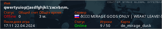 Играет на Counter Strike Global Offensive сервере. Страна: РоссияПервый раз замечен 17:11 22.04.2024
