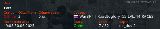 Играет на Counter Strike 1.6 сервере. Страна: РоссияПервый раз замечен 19:01 30.06.2025