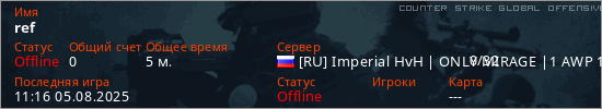 Играет на Counter Strike Global Offensive сервере. Страна: РоссияПервый раз замечен 11:12 05.08.2025