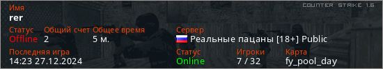 Играет на Counter Strike 1.6 сервере. Страна: РоссияПервый раз замечен 13:41 27.12.2024