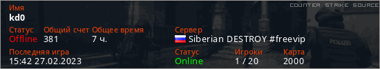 Играет на Counter Strike Source сервере. Страна: РоссияПервый раз замечен 15:26 16.02.2023