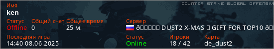 Играет на Counter Strike Global Offensive сервере. Страна: РоссияПервый раз замечен 18:42 05.06.2025