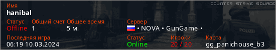Играет на Counter Strike Source сервере. Страна: РоссияПервый раз замечен 06:17 10.03.2024