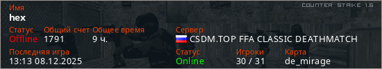 Играет на Counter Strike 1.6 сервере. Страна: РоссияПервый раз замечен 18:05 03.02.2022