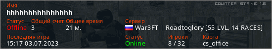 Играет на Counter Strike 1.6 сервере. Страна: РоссияПервый раз замечен 11:51 14.04.2023