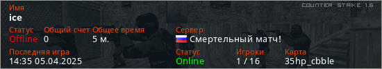 Играет на Counter Strike 1.6 сервере. Страна: РоссияПервый раз замечен 14:27 05.04.2025