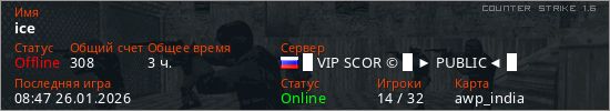 Играет на Counter Strike 1.6 сервере. Страна: РоссияПервый раз замечен 18:22 14.08.2025