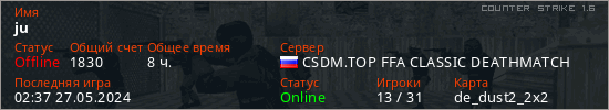 Играет на Counter Strike 1.6 сервере. Страна: РоссияПервый раз замечен 16:07 10.01.2022