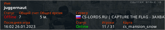 Играет на Counter Strike 1.6 сервере. Страна: РоссияПервый раз замечен 16:00 26.01.2023