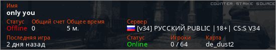 Играет на Counter Strike Source сервере. Страна: РоссияПервый раз замечен 18:56 16.12.2025