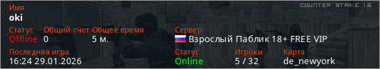 Играет на Counter Strike 1.6 сервере. Страна: РоссияПервый раз замечен 16:21 29.01.2026