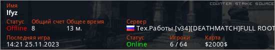 Играет на Counter Strike Source сервере. Страна: РоссияПервый раз замечен 11:06 23.10.2023
