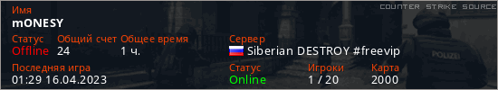 Играет на Counter Strike Source сервере. Страна: РоссияПервый раз замечен 08:13 08.02.2023