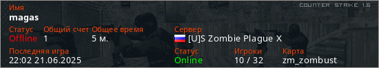 Играет на Counter Strike 1.6 сервере. Страна: РоссияПервый раз замечен 22:00 21.06.2025