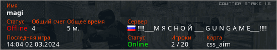 Играет на Counter Strike 1.6 сервере. Страна: РоссияПервый раз замечен 13:49 02.03.2024
